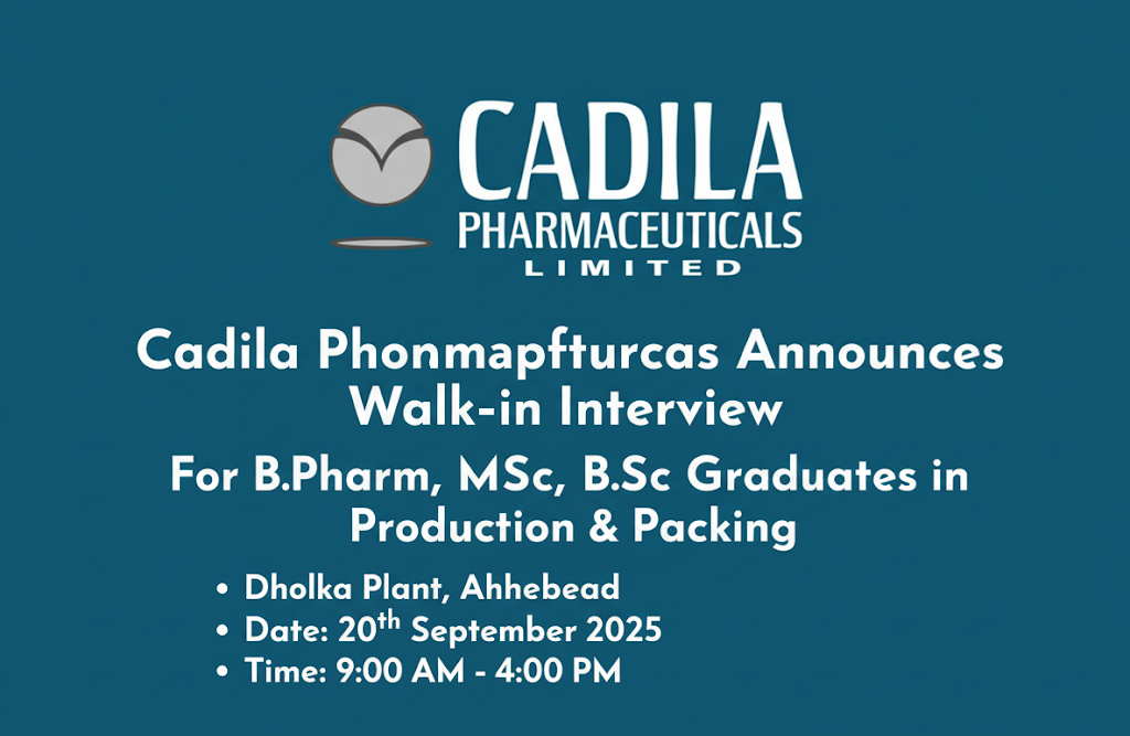 Cadila Pharmaceuticals, a prominent Indian multinational pharmaceutical company, is conducting a walk-in interview to fill multiple positions in its Production and Central Packing departments. The recruitment drive is for the company’s manufacturing plant in Dholka, near Ahmedabad.