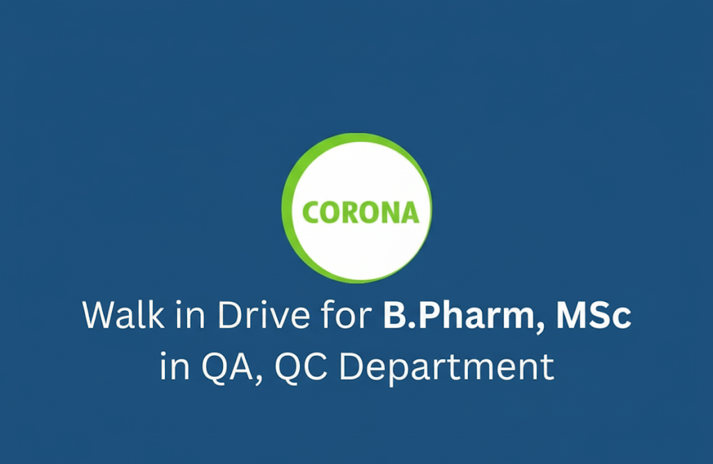 CORONA Remedies Private Limited, one of India’s youngest top 40 pharmaceutical companies, is conducting a Walk-in Interview for experienced professionals in Quality Control (QC) and Quality Assurance (QA).