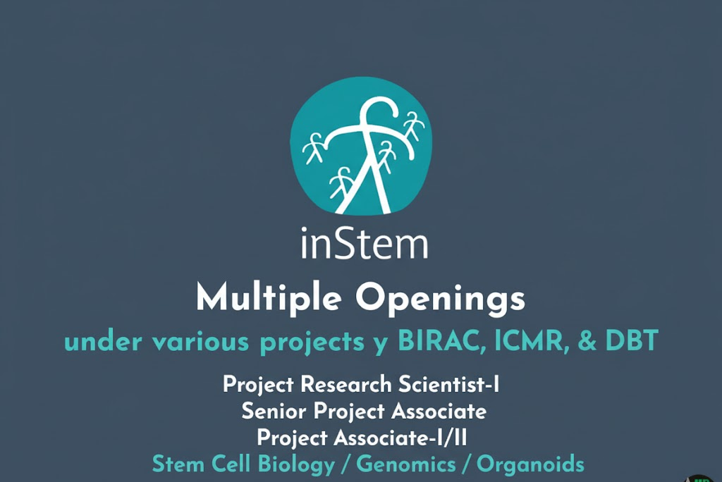 The Institute for Stem Cell Science & Regenerative Medicine (inStem), Bangalore, an autonomous institute under the Department of Biotechnology (DBT), has announced several contractual openings for dedicated research professionals under various projects funded by BIRAC, ICMR, and DBT in the laboratory of Dr. Dhandapani S P.
