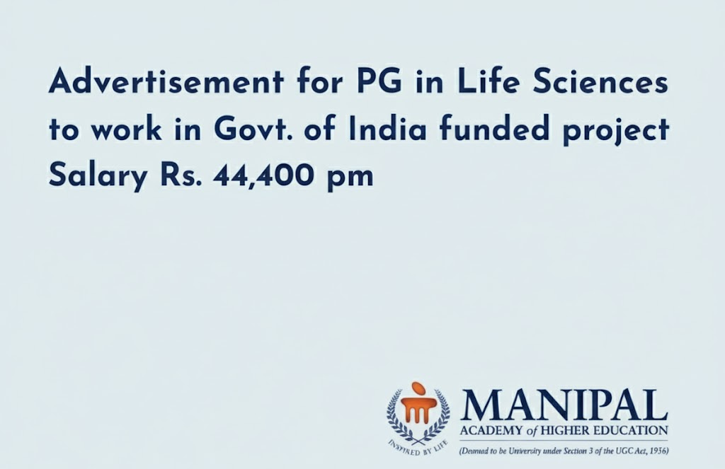 Manipal Academy of Higher Education (MAHE), an Institute of Eminence, invites applications for the position of Junior Research Fellow (JRF) for a DHR, Govt. of India funded project. The project is titled “Evaluating deubiquitinases as the newer mode of rescue of hyperlipidemia laden pancreatic β-cells” and will be conducted at the Manipal Institute of Regenerative Medicine (MIRM) in Bengaluru.