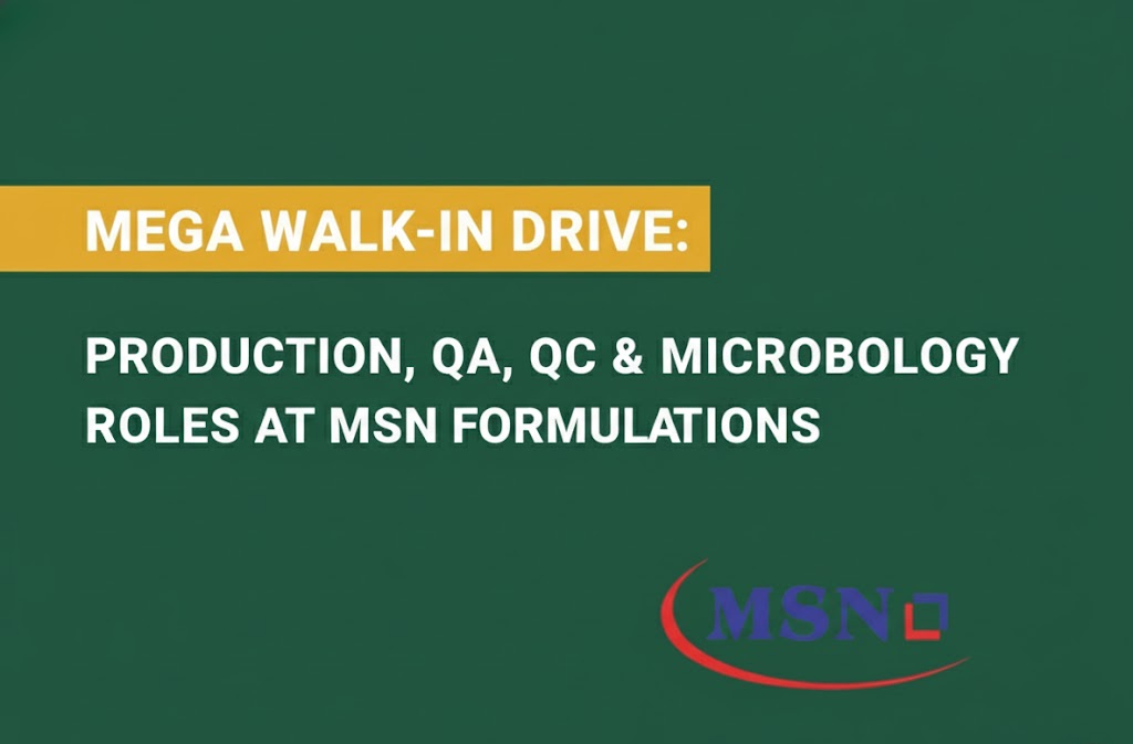MSN Group, one of India’s fastest-growing, research-based pharmaceutical companies with a mission to make healthcare affordable, is conducting a large-scale Walk-In Interview drive for its Formulation units in Telangana. The group has an integrated R&D center and multiple manufacturing facilities approved by regulatory bodies like the USFDA.