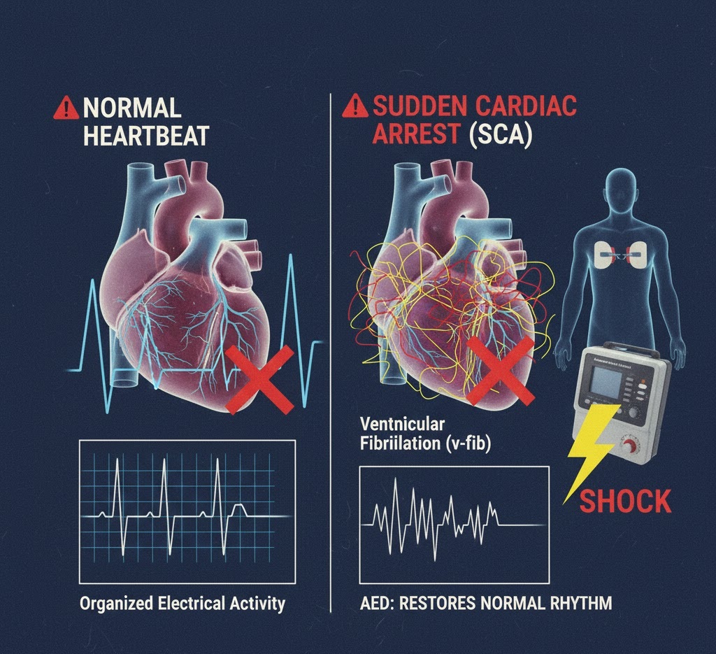 Sudden Cardiac Arrest (SCA) is a life-threatening medical emergency where the heart abruptly stops beating. Unlike a “plumbing” issue where blood is blocked, SCA is an electrical malfunction. When the heart stops, blood flow to the brain and vital organs ceases immediately. Without intervention, death occurs within minutes. However, rapid treatment with a defibrillator can restart the heart and save a life.