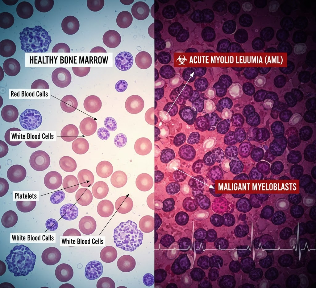 In Acute Myeloid Leukemia (AML), the marrow produces large numbers of abnormal myeloblasts (immature white blood cells). These “blasts” multiply rapidly and “crowd out” healthy cells, leading to a shortage of functional blood components.
