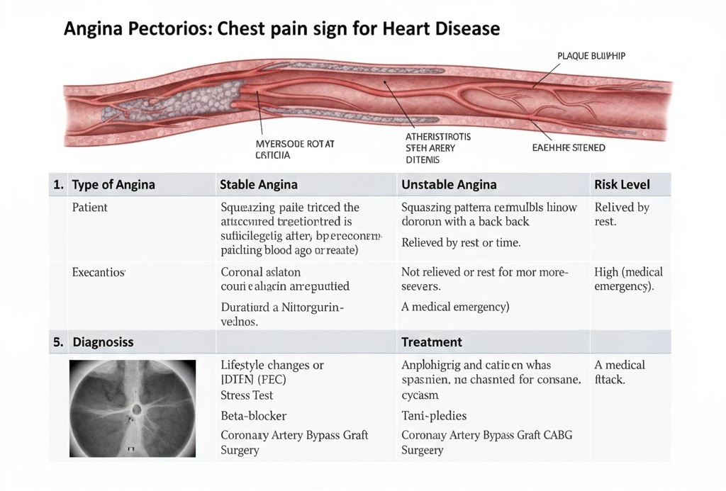 | Stable Angina | Follows a predictable pattern; lasts a short time (5 mins or less). | Physical exertion, emotional stress, or heavy meals. | Rest or Nitroglycerin (medicine). |