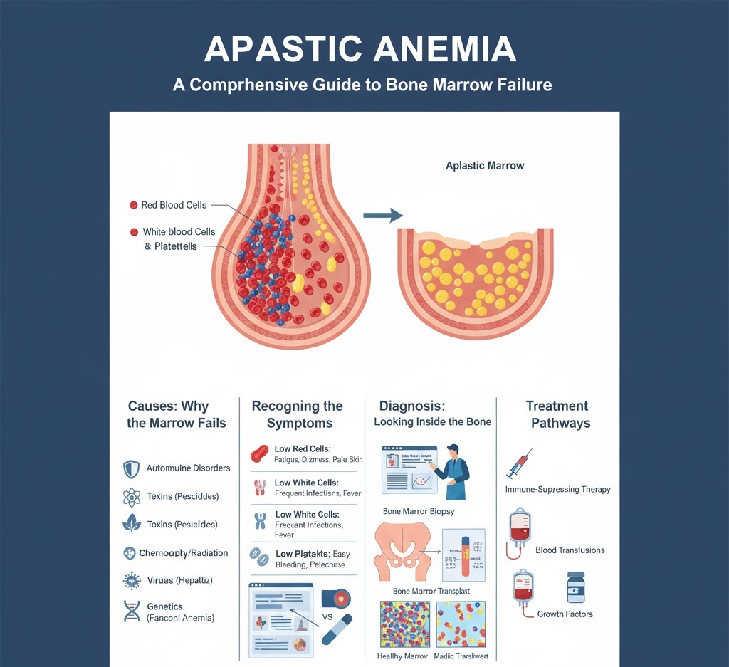 Aplastic anemia is a rare and life-threatening condition where the body stops producing enough new blood cells. Unlike other forms of anemia that might be caused by a lack of iron or vitamins, aplastic anemia is a “factory problem” located in the bone marrow.
