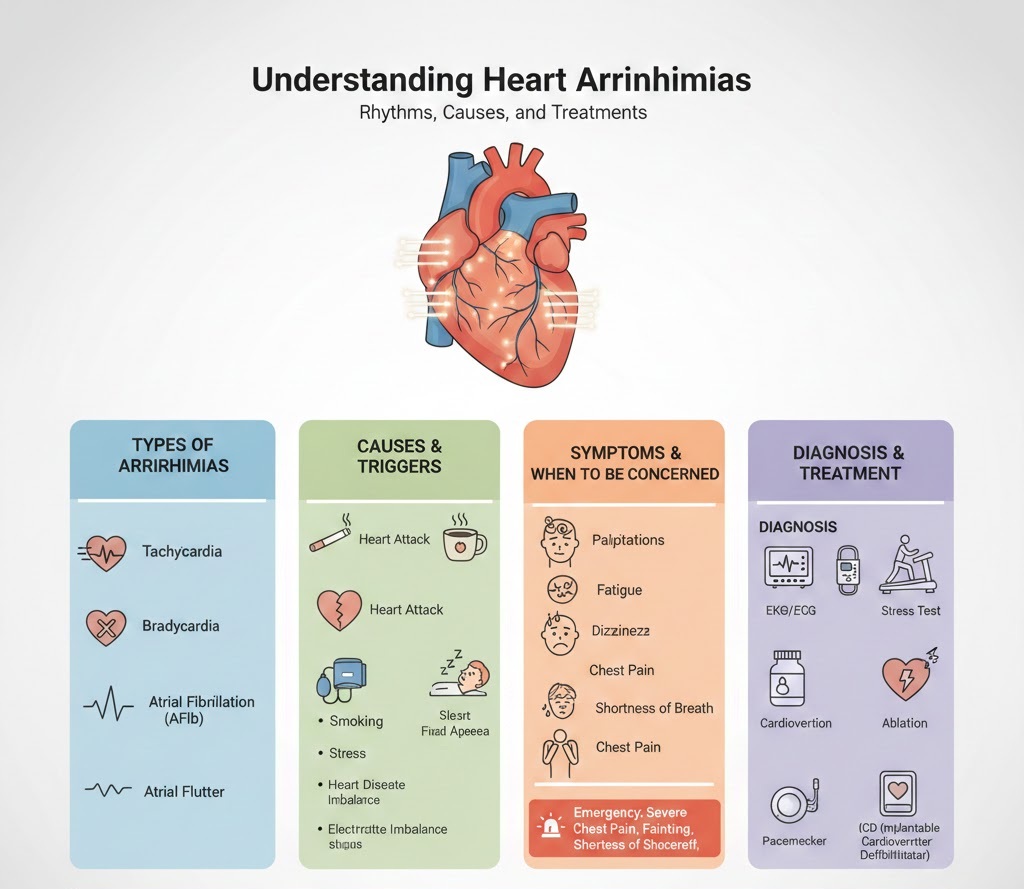 An arrhythmia is a disruption in the rate or rhythm of your heartbeat. While a healthy heart follows a steady, coordinated electrical sequence to pump blood, an arrhythmia occurs when these electrical signals misfire, causing the heart to beat too fast, too slow, or erratically.
