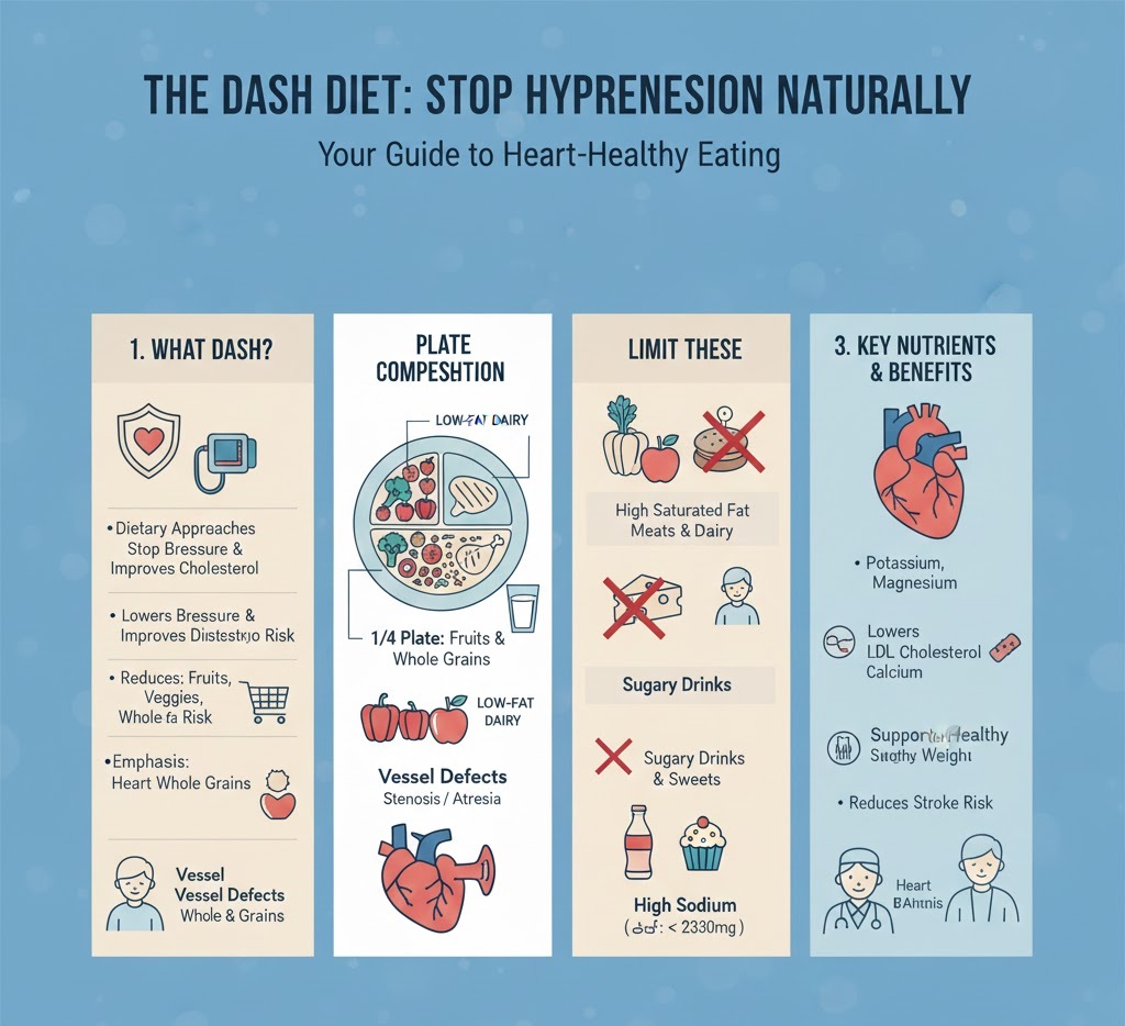 DASH stands for Dietary Approaches to Stop Hypertension. Developed through research sponsored by the National Heart, Lung, and Blood Institute (NHLBI), this eating plan is specifically designed to help lower blood pressure and improve heart health without the use of medication.