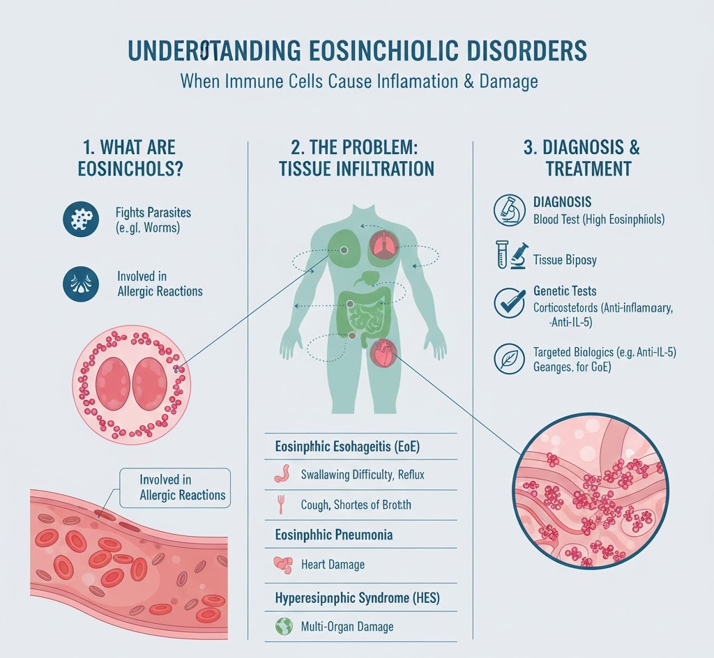 | Hypereosinophilic Syndrome (HES) | Multiple Organs | Persistent high levels that damage the heart, skin, or nervous system. |