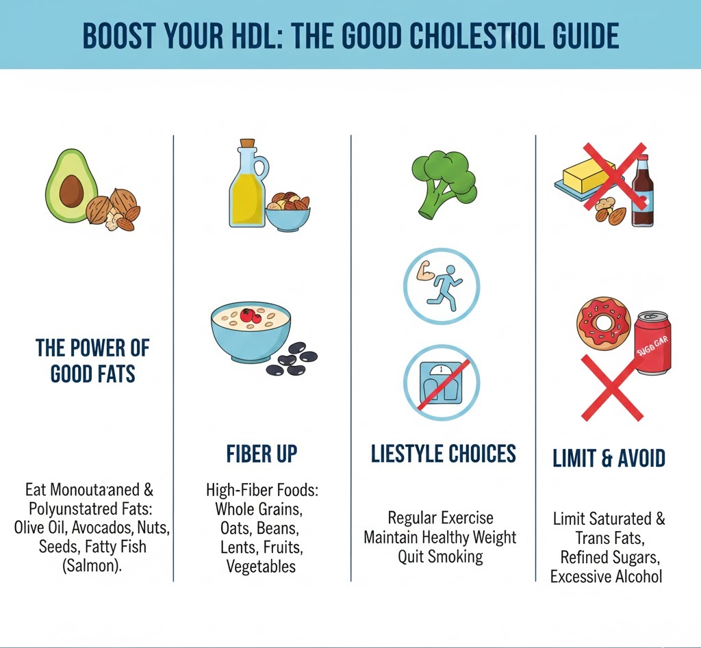 - Get Moving: Regular aerobic exercise (30 minutes most days) is one of the most effective ways to raise HDL.
