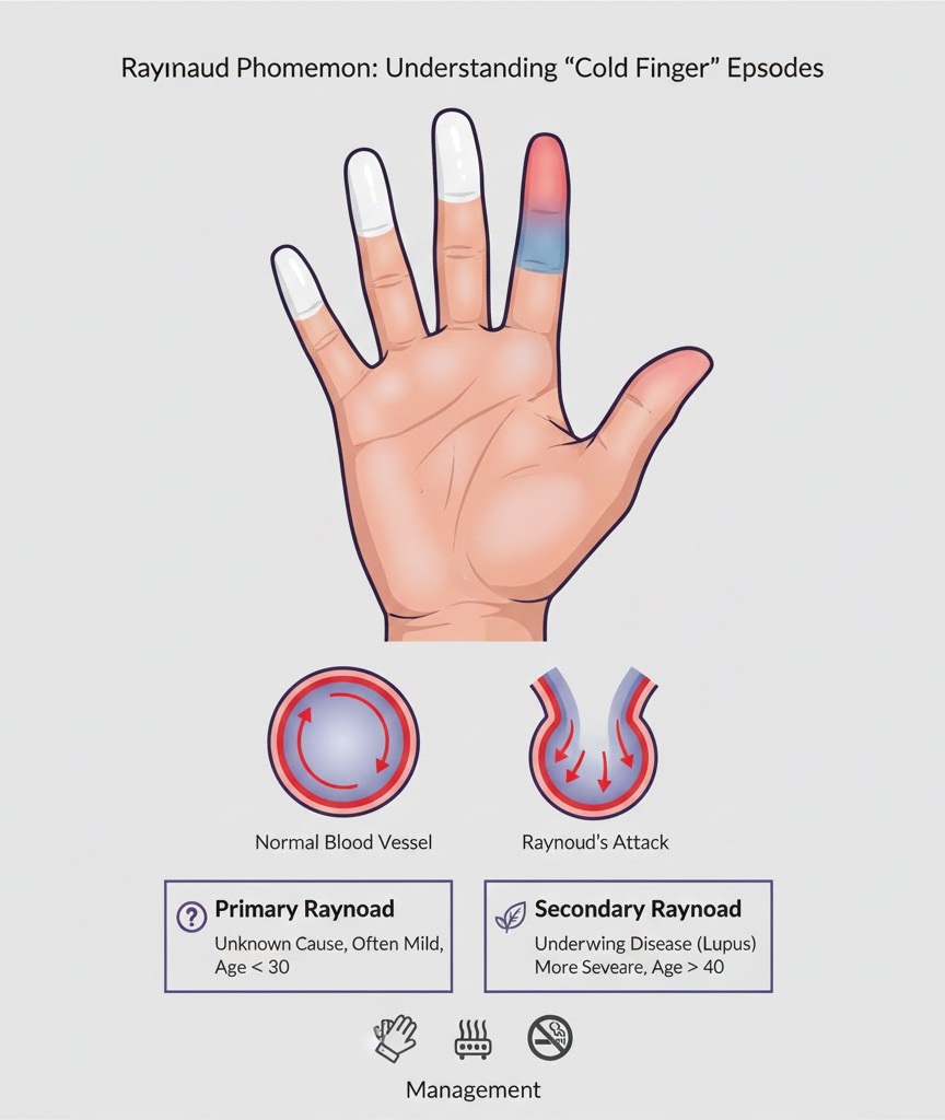 Raynaud phenomenon is a condition where the small blood vessels in the extremities—most commonly the fingers and toes—overreact to cold temperatures or emotional stress. This overreaction causes the vessels to constrict (narrow) suddenly, severely limiting blood flow.