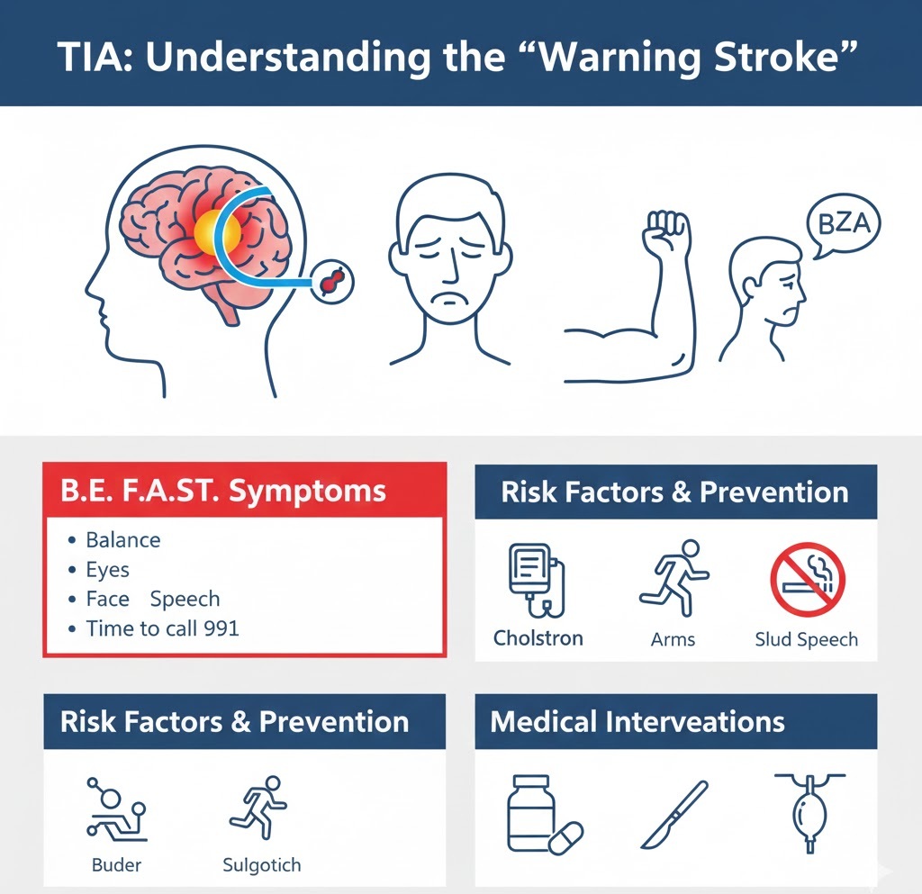 A Transient Ischemic Attack (TIA) is often called a “mini-stroke.” It occurs when the blood supply to a part of the brain, spinal cord, or retina is briefly blocked. Unlike a full stroke, the blockage is temporary and does not cause permanent brain damage—however, it is a medical emergency and a critical warning sign that a major stroke may be imminent.