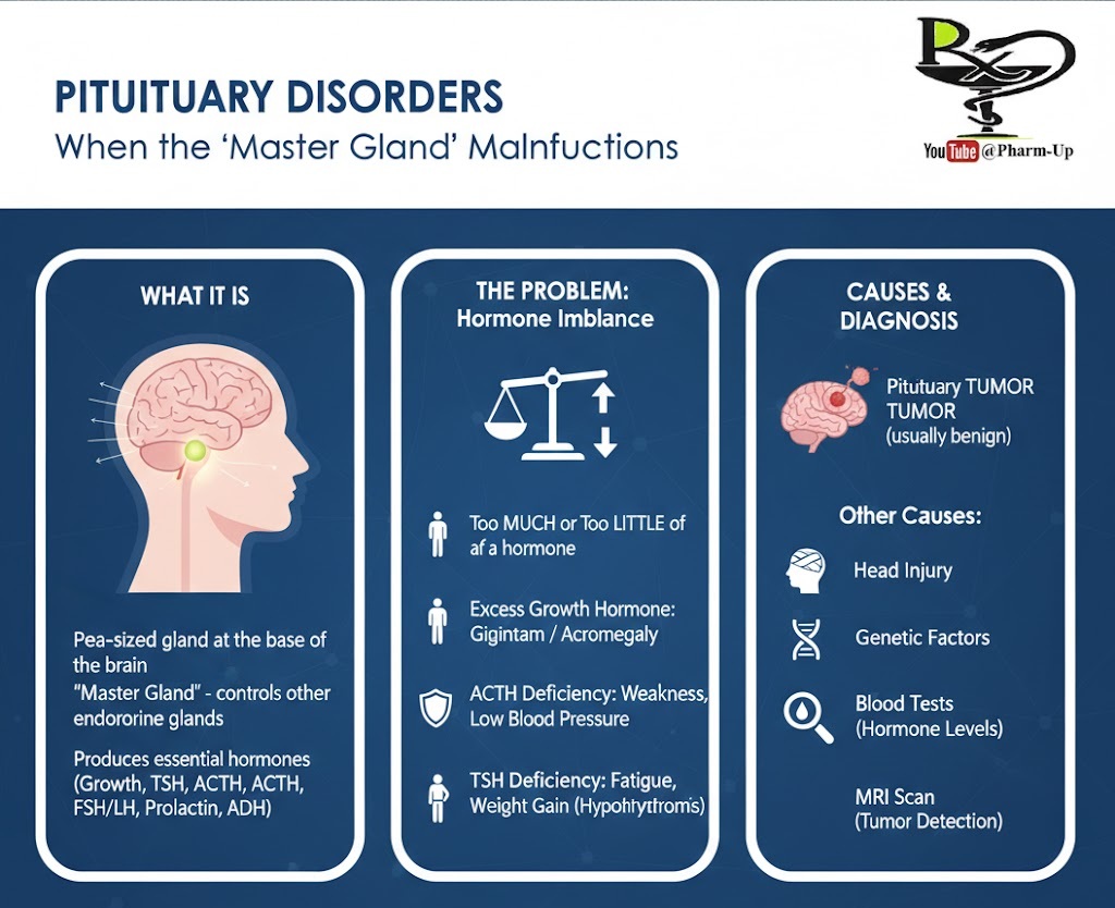 • Hypopituitarism: A condition where the gland fails to produce enough of one or more hormones, leading to fatigue, weakness, or growth issues.