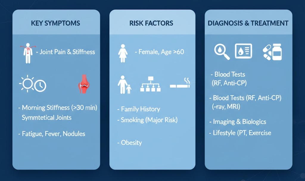- Blood Tests: Checking for Rheumatoid Factor (RF) and Anti-CCP antibodies, as well as inflammatory markers (ESR and CRP).