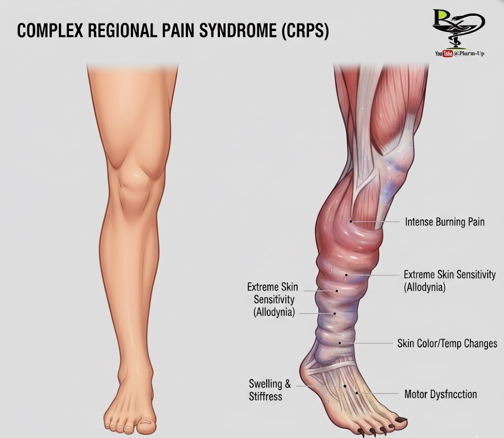 Complex Regional Pain Syndrome (CRPS) is a high-intensity chronic pain condition that typically affects a single limb (arm, leg, hand, or foot), usually following an injury. It is considered one of the most painful long-term conditions, often rated higher than amputation or childbirth on the McGill Pain Index.