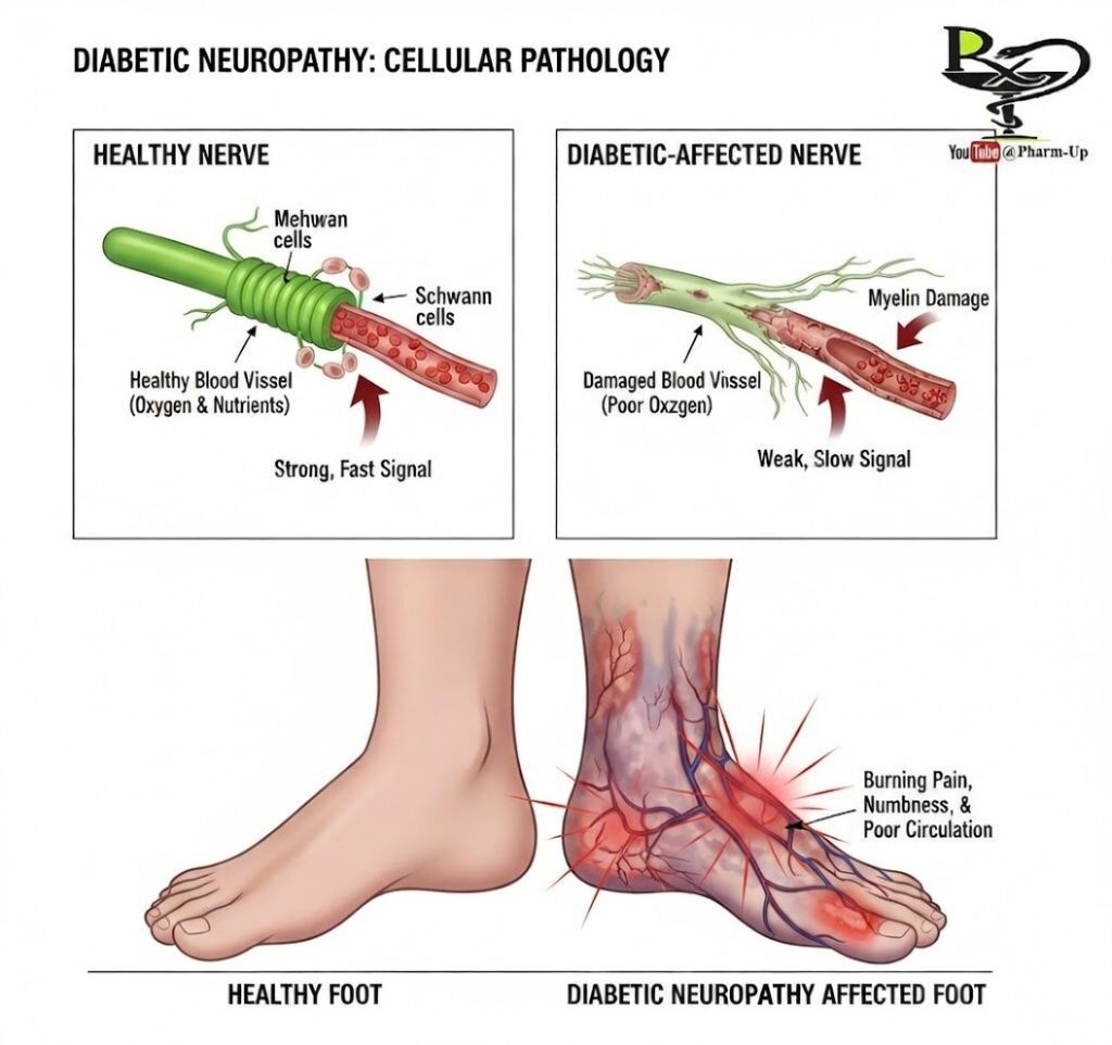- Vascular Damage: High sugar weakens the capillary walls, “starving” the nerve of oxygen.