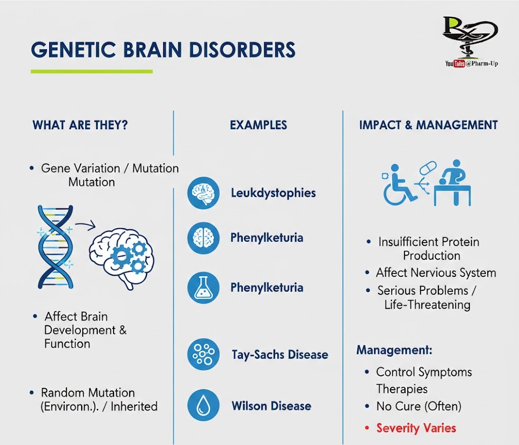 A genetic brain disorder occurs when a variation (a different form of a gene) or a mutation (a permanent change in a gene) disrupts the normal development and function of the brain. These changes often result in the body failing to produce vital proteins needed for neurological health.