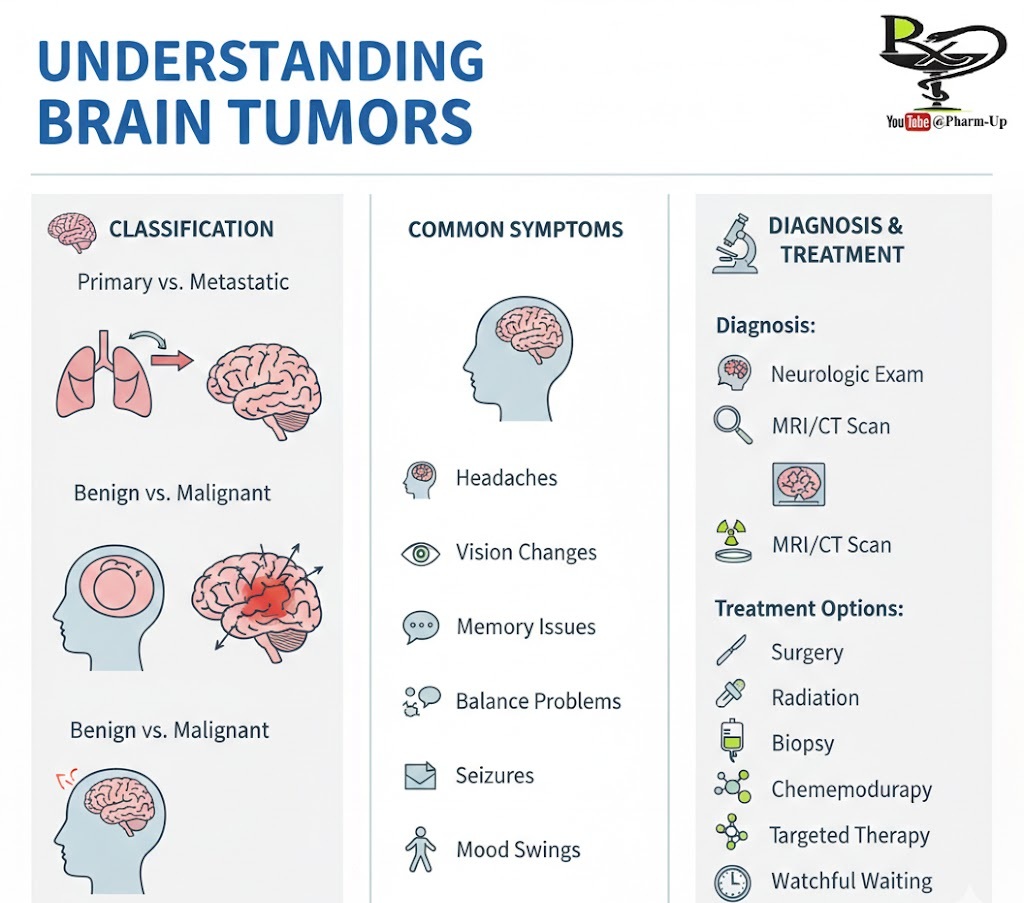 Because the brain controls every bodily function, symptoms often depend on the tumor’s size and location. Common warning signs include: