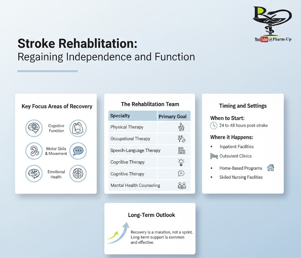 Stroke rehabilitation is a comprehensive, goal-oriented program designed to help survivors relearn skills lost due to brain damage. When a stroke occurs, the resulting loss of blood flow can damage areas responsible for movement, language, and cognition. Rehabilitation focuses on neural plasticity—the brain’s ability to rewire itself—to help patients become as independent as possible.
