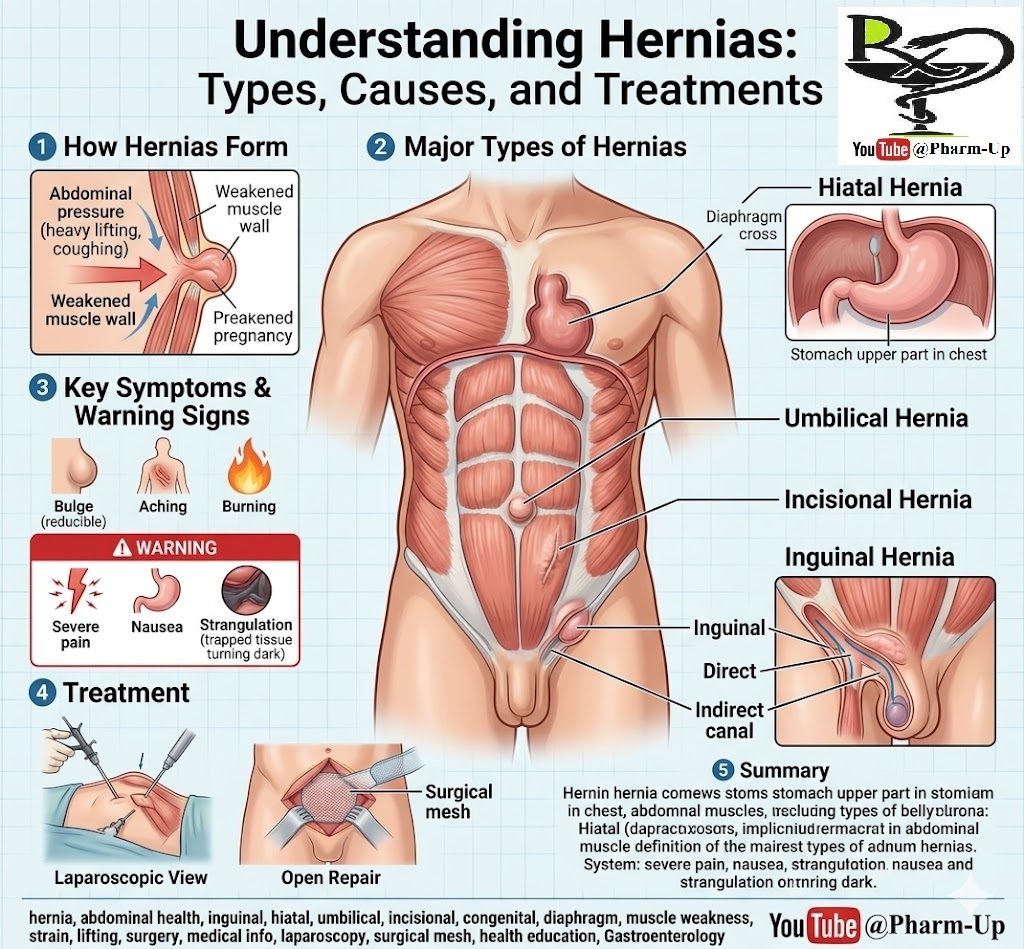 A hernia occurs when an internal organ, or the fatty tissue surrounding it, protrudes through a weak spot or tear in the surrounding muscle or connective tissue (fascia). While they most commonly manifest in the abdominal wall, they can occur in several regions of the body.
