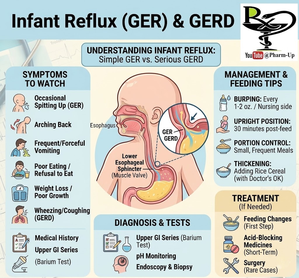 Diagnosis: Usually based on medical history. If symptoms are severe, tests like an Upper GI series (Barium test), pH monitoring, or an Endoscopy may be used.