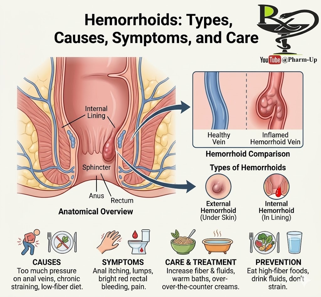 Hemorrhoids are swollen, inflamed veins located around the anus or the lower part of the rectum. They are classified into two main types based on their location: External (under the skin around the anus) and Internal (inside the lining of the anus and lower rectum).