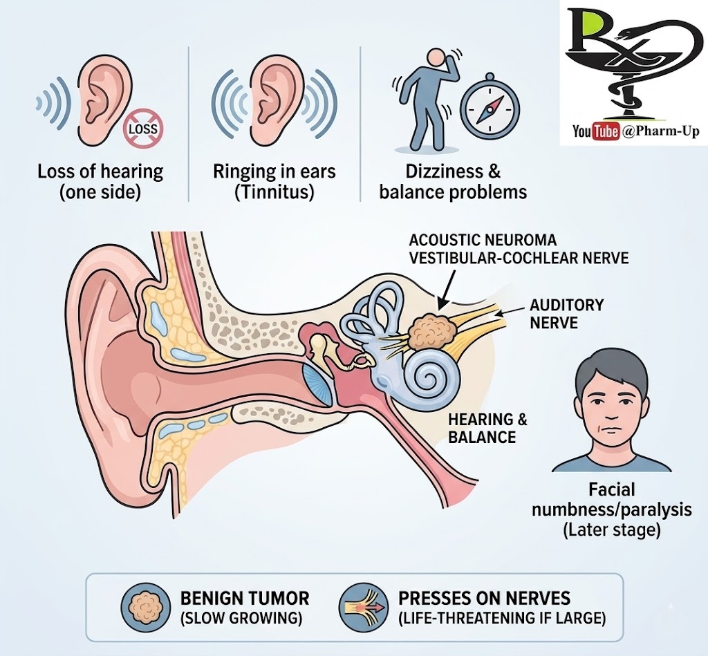 Note: If tumors occur on both hearing nerves, it is frequently linked to a genetic condition known as Neurofibromatosis Type 2 (NF2).